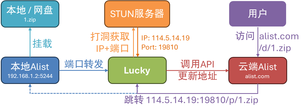 STUN 技术允许 NAT1 用户获取公网端口,通过路由端口转发或者 LUCKY 内置转发,将内网服务端口暴露到外网,从而实现内网穿透的目的