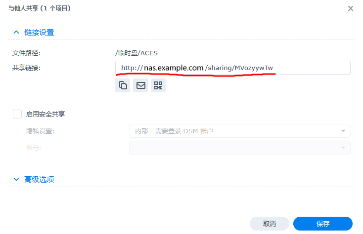 在群辉默认分享的时候,可以设置一下固定地址,可以免去修改地址的繁琐